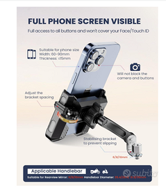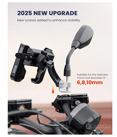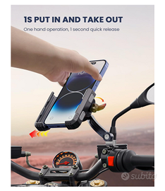 Supporto telefono moto da specchietto, universale fino a 7 pollici con rotazione 360Vendo Supporto telefono moto da specchietto, universale fino a 7 pollici con rotazione 360. Nuovo con scatola e accessori. Il telefono si sgancia in maniera super rapida , grazie al tasto di lato. Ottima stabilità anche ad alte velocità e strade sconnesse. Non da troppe vibrazioni. Il supporto può essere girato fino a 360 gradi . Permettendo l'utilizzo del navigatore in maniera ottimale e comoda . Il telefono è protetto da una membrana interna in gomma che non lo graffia . Molto versatile per moto scooter etc .