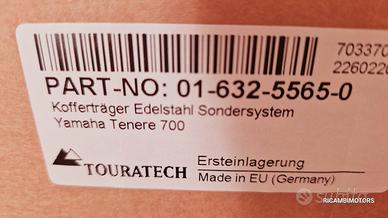 I telaietti/supporti in acciaio inox Touratech per la T7 è un robusto portabagagli pensato per la valigia ZEGA Evo, ZEGA Pro, ZEGA Pro2 e ZEGA Mundo della Touratech. Il perfetto sistema di valige per i lunghi viaggi. Non solo si adatta esteticamente al telaio della Tenere ma è anche un sistema inossidabile realizzato in tondino di acciaio da 18 mm e garantisce quindi una particolare maggior stabilità anche lontano dalle normali strade.