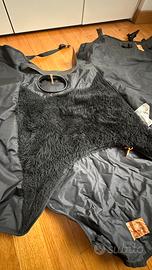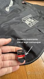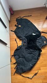 Termoscud R081 Il coprigambe Termoscud è dotato di un sistema brevettato per evitare lo sventolio ad alta velocità. La coperta è in buone condizioni tranne un gancetto rotto (lo spiego bene nella foto) ma che funziona comunque. Grande tasca portaoggetti, il coprisella è integrato nella copertina. Pagato 130€