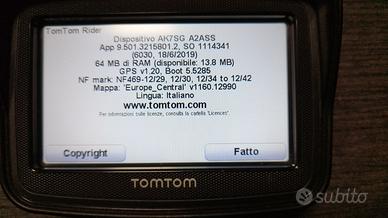TOMTOM RIDER V4 modello 4GD00 in discrete condizioni, schermo in buone condizioni privo di graffi evidenti, corpo navigatore in buone condizioni con normali segni d'uso, supporto moto con parte inferiore danneggiata ma che comunque non pregiudica la solidità del montaggio e/o il funzionamento (tra l'altro poco visibile trattandosi della parte inferiore .... allego comunque una foto). Confezione originale con gli accessori visibili in foto, ovvero: supporto RAM con snodo per attacco tubolare (manubrio); base collegamento con cavo alimentazione 12V; cavetto usb. Non è presente alimentatore di rete 230V. Ho aggiornato le mappe "Europa centrale" all'ultima versione; gli autovelox sono presenti ma non aggiornati (servizio a pagamento) ma credo che in rete si trovano i file giusti da caricare. Navigatore datato ma comunque ancora utilizzabile ed aggiornabile tramite il programma TOMTOM Home (aggiornato ieri le mappe). La batteria interna non mi sembra molto efficiente ma visto che viene collegato all'impianto della moto non mi sembra un gran problema. Comunque tenuto conto dell'età, del fatto che c'è la base danneggiata nella parte inferiore, della batteria non più efficiente lo vendo al prezzo di 50 Euro. Per favore non chiedetemi ribassi (mi sembra un prezzo più che onesto). Grazie