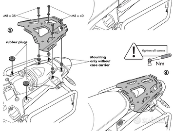 ATTENZIONE: mancano 4 viti e qualche ranella che possono essere però comprate in qualsiasi ferramenta (vedi quadretto con freccia negli immagini, le viti a destra del quadretto sono già montato sul portaborse)