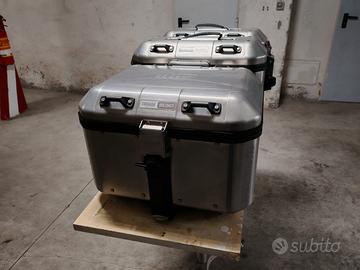Vendo tris valigie / bauli / bauletti in alluminio Givi Trekker Dolomiti composto da centrale 46 litri e coppia laterali 2X36 litri. Stato: ottime condizioni generali. Extra: Reti elastiche interne già montate + kit adattatori per telai Monokey inclusi per montare le laterali. Sicurezza: Unica chiave per tutto il set. Disponibilità ritiro diretto oppure spedizione con tre pacchi separati.