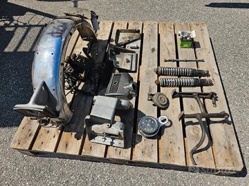 Scatolone con ricambi originali come da foto ,usati (no patacche cinesi ) contachilometri scala in miglia, cavalletto centrale parafango post cromato , parte in allumino del faro post. fianchetti sottosella in alluminio, sede filtro aria in alluminio , clacson , cablaggio elettrico principale ,coppia bobine accensione , ammortizzatori posteriori e altro, + coppia collettori scarico buoni da ricromare , a forfait causa pulizia officina moto ,versione Oil Frame 1971 non monta su ais bsa bmw norton ariel matcless indian royal enfield harley davidson per info Moreno 348-3366782 Udine preferito contatto whatts app per motivi di lavoro,non rispondo alle email