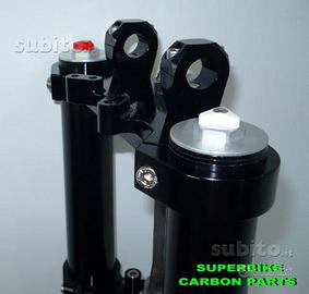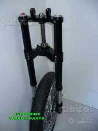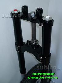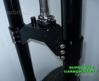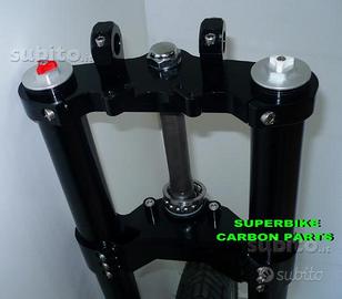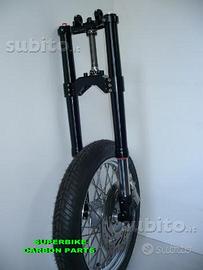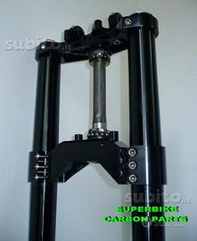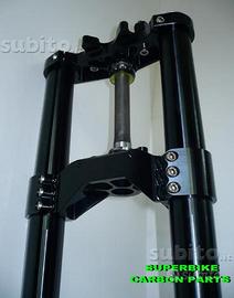 Presentiamo avantreno completo speciale per Bonneville costituito da: piastre di sterzo speciali ricavate dal pieno, forcella wp, pinza radiale brembo, perno ruota, flangia disco, boccole cerchio. Con il nostro kit potete modificare e/o sostituire l'avantreno della vostra moto e renderla unica. Il kit e' costituito da forcelle OHLINS (disponibili sia le Ohlins Road & track 43 che le nuovissime e super performanti Ohlins Nix 30), forcelle marzocchi , forcelle wp, piastre di sterzo speciali ricavate dal pieno, piedini forcella attacco radiale ricavati dal pieno, raiser manubrio in caso di naked oppure semimanubri in caso di moto sportive, pinze freno Brembo ad attacco radiale complete di pastiglie, staffe parafango e parafango in carbonio con perno ruota boccole e distanziali. Progettiamo e realiziamo un avantreno completo di tutte le parti. Le forcelle sono appositamente modificate nell'interasse e nell'idraulica per essere perfettamente compatibili con il tipo di moto. Potete utilizzare qualsiasi cerchio e dischi freno anteriori. Il kit può essere realizzato sia per pinze radiali sia per pinze ad attacco assiale (di cui sono dotate le moto più vecchiotte) o perimetrale (vedi Buell o alcune Harley Devidson). I nostri kit avantreni speciali si montano senza alcun problema e senza dover effettuare alcun adattamento. Tutte le parti ricavate dal pieno le possiamo anodizzare di qualsiasi colore . Anche la forma delle piastre di sterzo possono essere realizzati appositamente su specifiche del cliente. Per il montaggio delle piastre di sterzo si utilizzano boccole e cuscinetti originali. Possiamo realizzare cave di alleggerimento passanti sia sulla piastra di sterzo superiore che inferiore. Predisposizione attacco blocchetto accensione se necessario e attacco ammortizzatore di sterzo eventualmente. Progettiamo e Realizziamo avantreni speciali per cafe racer, scrambler, streetfighter, superbike, prototipi........
