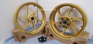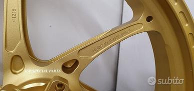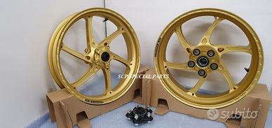 CERCHI OZ GASS RSA RS-A, specifiche per: TRIUMPH DAYTONA 675 TRIUMPH DAYTONA 675 MOTO2 TRIUMPH STREET TRIPLE 675 TRIUMPH STREET TRIPLE S 660 cc TRIUMPH STREET TRIPLE R 765 cc TRIUMPH STREET TRIPLE RS 765 cc Misura post. 5,50x 17 Misura ant. 3,5x17. Peso 7,65 kg circa la coppia!!! MOLTI KG IN MENO DEGLI ORIGINALI PLUG AND PLAY SI MONTANO SENZA MODIFICHE. Direttamente dai campi di gara della SBK ora disponibile anche per tutti gli appassionati. La ruota in lega di alluminio più leggera per uso stradale e pista. Si avvale di tutte le estremizzazioni sviluppate sui campi di gara, tra cui l'alleggerimento canale HLT e la razza a doppia sezione. Nessun compromesso per questa ruota. La notevole centralizzazione delle masse ottenuta nella realizzazione di questa tipologia di cerchi, abbinata all'estrema leggerezza, fa si che vi sia una diminuzione drammatica dell'effetto giroscopico. Ciò si traduce in cambi di direzione fulminei abbinati alla possibilità di ritardare molto di più la staccata e alla capacità nettamente superiore della moto di tenere la corda e poter disegnare traiettorie molto più strette a netto vantaggio dell'uscita di curva. Disponibile anche con finitura superficiale esclusiva in titanio. Ruote fornite complete di mozzo porta corona per corone specifiche. DISPONIBILI NEI COLORI ANODIZZATI: nero opaco nero lucido oro titanio