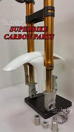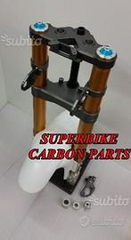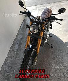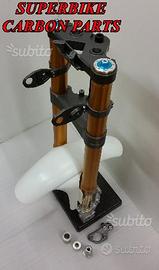 Kit cotituito da: forcelle ohlins da 800mm. Piastre di sterzo speciali ricavate dal pieno corredate di tutti gli attacchi standard. Supporti faro e frecce ricavati dal pieno. Staffa supporto pinza freno originale ricavata dal pieno. Parafango in fibra con staffe di supporto ricavate dal pieno. Staffa supporto blocchetto accensione ricavata dal pieno. Staffa porta regolatore ricavata dal pieno. Boccole per perno ruota originale. Il kit è plug and play ovvero si monta senza modifiche. Mantenete il cerchio anteriore e la pinza freno originale. Piastre di sterzo speciali ricavate dal pieno e sovradimensionate con piastra inferiore da 60 mm a 2 o 3 punti di chiusura oppure 80 mm a 4 punti di chiusura con cave di alleggerimento passanti. Riser o semimanubri a richiesta. Tutto il kit può essere progettato specificatamente su richiesta anche per modifica dell'impianto frenante in modo da poter utilizzare pinze freno radiali e doppio disco. Per il montaggio delle piastre di sterzo si utilizzano boccole e cuscinetti originali. Tutte le parti ricavate dal pieno possono essere anodizzate di qualsiasi colore. Tutti gli accessori menzionati sono nuovi. Possiamo progettare e realizzare qualsiasi specifica atta a rendere unica tale tipologia di prodotto. Tutte le parti ricavate dal pieno possono essere progettate e realizzate direttamente su specifiche tecniche ed estetiche del cliente. Con i nostri kit potete modificare e/o sostituire l'avantreno di qualsiasi moto e renderla unica. Potete utilizzare qualsiasi cerchio, dischi freno e pinze. Il kit può essere realizzato sia per pinze radiali sia per pinze ad attacco assiale o perimetrale. Possiamo fornire come optional: cerchi Oz, Dymag, Pvm, dischi e pinze brembo, parafango carbonio, off set regolabile delle piastre. Progettiamo e Realizziamo avantreni per cafe racer, scrambler, streetfighter, superbike, prototipi.