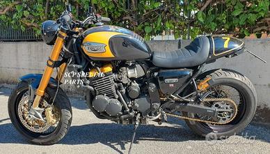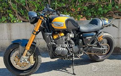 Progettiamo e Realizziamo allestimenti moto con avantreni dotati di forcelle ohlins e freni brembo, monoammortizzatori ohlins, cerchi a raggi etc.. su misura per: cafe racer, scrambler, custom, streetfighter, superbike, prototipi, show bike, maxi enduro, off road, maxi scooter, brat. ESCLUSIVITA', PERFORMANCE, SICUREZZA ED ESTETICA AL TOP! PRESENTIAMO ALLESTIMENTO SU MISURA PER TRIUMPH THUNDERBIRD 900 ( su richiesta anche per qualsiasi altro modello), costituito da: - FORCELLE OHLINS a stelo rovesciato allestite su misura in base al progetto, disponibili nel modello NIX con stelo da 48mm e fodero da 58mm (quelle in foto) , oppure OHLINS NIX SUPERBIKE con stelo da 43mm e fodero da 58mm. - PIEDINI FORCELLE RADIALI, su richiesta anche ricavati cnc - KIT PIASTRE DI STERZO RICAVATE DAL PIENO SU MISURA - RISER MANUBRIO OPPURE COPPIA SEMIMANUBRI RICAVATI DAL PIENO - POMPA FRENO BREMBO RCS CORSA CORTA - POMPA FRIZIONE BREMBO RCS - PINZE BREMBO RADIALI (vari mod. disp.) - DISCHI BREMBO SUPERSPORT da 320mm (vari mod. disp.) - PINZA POSTERIORE BREMBO ROVESCIATA CON STAFFA SUPPORTO CNC - TUBAZIONI IN TRECCIA - STAFFE FARO, CRUSCOTTO E PARAFANGO RICAVATE CNC - PARAFANGO CARBONIO - COPPIA CERCHI A RAGGI FLUOFORMATI CON MOZZI CNC PROTOTIPATI SU MISURA - CATENA CORONA PIGNONE ALLEGGERITI 520 - AMMORTIZZATORE POST. OHLINS PRESSURIZZATO PROTOTIPATO SU MISURA - QUADRO STRUMENTI DIGITALE IL KIT MONTA PLUG AND PLAY QUINDI SENZA MODIFICHE. Tutte le parti ricavate dal pieno, i foderi forcelle e anche i cerchi possono essere anodizzate di qualsiasi colore su richiesta. Piastre di sterzo sovradimensionate con piastra inferiore da 60 mm a 6 punti di chiusura con alleggerimenti passanti laterali. Su richiesta anche da 80mm oppure 100mm a 8 o 10 punti di chiusura Piastra di sterzo superiore maggiorata a 2 punti di chiusura anche con alleggerimenti passanti laterali su richiesta e a 4 punti di chiusura. Possiamo progettare e