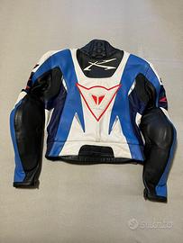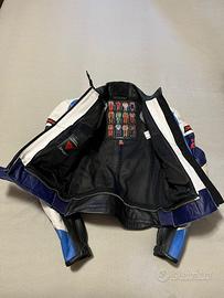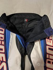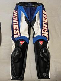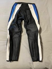 Tuta moto donna Dainese originale 2 pezzi in pelle divisibile, colore blu/bianco/nero stile racing vintage. Usata pochissime volte, condizioni molto belle. Completa di protezioni ginocchia e zip di collegamento giacca-pantalone. Ideale per moto sportiva, pista o collezionisti Dainese old school. Normali segni minimi del tempo.