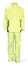 Tuta antipioggia divisibile poliestere rivestimento in PVC giallo segni riflettenti Completo giacca e pantaloni antipioggia in poliestere con rivestimento in PVC, 100% impermeabile con dettagli riflettenti per una migliore visibilita' notturna. Una giacca con cappuccio nel colletto, cerniera con bottoni "storm flap". Chiusura ai polsi e in vita con due tasche esterne.
