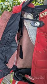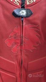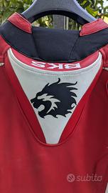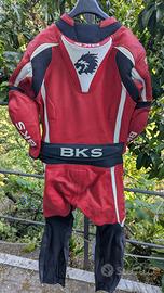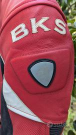 Tuta in pelle da moto divisibile, interamente traforata, protezioni su ginocchia, fianchi, gomiti e spalle, livello 2. Assolutamente mai pista, mai caduto, nessun danno. BKS Lion (Versione Divisibile). Materiali Esterni: Pelle: Pelle bovina di alta qualità (cowhide), con spessore variabile tra 1.1 mm e 1.3 mm. Pannelli forati: Ampi inserti in pelle traforata sul torace e sulle braccia per la ventilazione. Inserti Elasticizzati: Pannelli in tessuto aramidico (Kevlar)all'interno delle braccia, nell'inguine e dietro le ginocchia per garantire flessibilità. Soffietti in pelle: Inserti a fisarmonica sopra le ginocchia e nella zona lombare per facilitare i movimenti in sella. Protezioni e Sicurezza: Protezioni Interne: Protezioni omologate CE (EN 1621-2) su spalle, gomiti e ginocchia. Rinforzi: Doppio strato di pelle nelle zone critiche di impatto e sfregamento (spalle, seduta e ginocchia). Saponette: Velcro esterno sulle ginocchia predisposto per l'aggancio di slider (saponette) intercambiabili. Cuciture: Realizzate con filo di nylon ad alta resistenza, doppie o triple nei punti di stress.