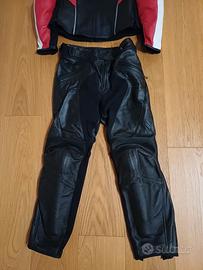 Tuta Dainese donna in pelle, taglia 42- 44, divisibile con zip ed inserti elastici, fodera in mesh traspirante, protezioni gomiti ginocchia e spalle (alluminio), 2 tasche esterne, taschino sul petto e tasca interna. Il giubbotto ha due zip posteriori per aprire l'areazione in estate. Il colore è nero