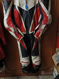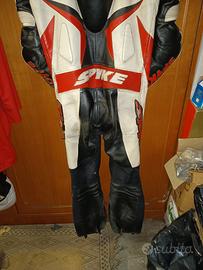 Tuta intera traforata sfoderabile e lavabile, protezioni spalle,avambracci,gomiti, tibie e ginocchio. ottima per chi vuole una tutta tecnica senza spendere almeno 1000€. in buone condizioni,solo una piccola scivolata che ha solo grattato un pochino il colore, la pelle è integra.