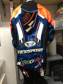 Vendo tuta intera TEXSPORT (Azienda storica della prov. di TO), fatta su misura (180 cm x 90 Kg, assimilabile ad una 52/54) in pelle bovina, tutta traforata, colore Blu / Arancio / Nero.