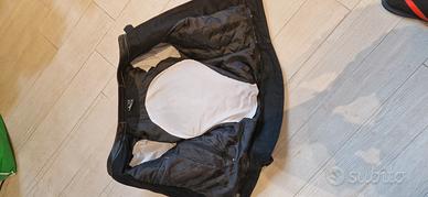 Tuta in pelle di bovino da 1.3mm, 2 pezzi con robusta zip di connessione, completa di protezioni su spalle, gomiti (placca lunga fino quasi al polso), schiena e ginocchia, dotata anche di cuscinetto paraschiena e saponette incluse.