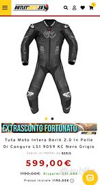 Vendo Tuta Moto Intera Berik 2.0 In Pelle Di Canguro LS1 9059 KC Nero Grigio - taglia 54, nuova ( usata 1 sola volta). Vendo per errato acquisto e per passaggio a modello divisibile.