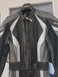 tuta da moto in pelle Spyke, un modello divisibile in due pezzi (giacca e pantaloni) nei colori nero e grigio.