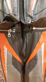 Tuta moto divisibile in due pezzi Dainese, realizzata in pelle, composta da giacca e pantalone uniti da una zip comoda e resistente che corre lungo tutta la vita. La massima protezione è garantita dalla presenza di protezioni composite su ginocchia, gomiti e spalle. È possibile massimizzare l’aerodinamica e la stabilità dello stivale grazie alla zip sul fondo gamba, che ne allarga la parte inferiore e permette di bloccare lo stivale.