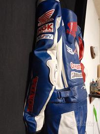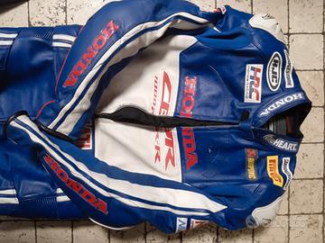 tuta moto Honda marca gimoto divisibile nessun strappo mai caduta perfetta. taglia da altezza da1;78 a 1;85 circa peso 85 a 95 kg