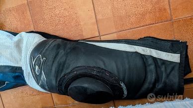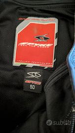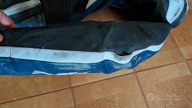 Taglia 50 con qualche strusciata come mostrato in foto, nessuno strappo , protezioni su spalle gomiti e ginocchia, no paraschiena solo gobbetta.