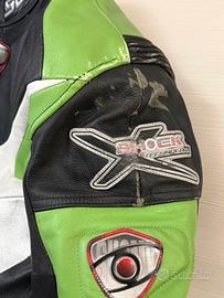 La tuta è usata e presenta segni di usura estetici dovuti all'utilizzo in pista (abrasioni superficiali su spalle e avambracci, come visibile in foto), che però non ne compromettono l'integrità strutturale o la sicurezza. Le cerniere sono tutte originali e perfettamente funzionanti. È stata sempre pulita e trattata con prodotti specifici per la pelle.
