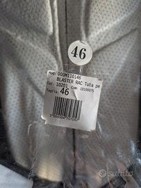 Tuta moto Spyke Blaster, taglia 46, colore bianco con inserti neri. In buone condizioni presenta una piccola abrasione sul lato sinistro (gomito) in seguito ad una scivolata ma non presenta tagli o lacerazioni.