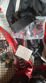 roba rimasta in cantina per circa 15 anni. tuta taglia 52 completa di tutto, anche rete interno tuta che non c'è in foto, 2 kit lettere alfabeto completo. qualche strisciata in pista con scooter bassa velocità. 350€ guanti kangaroo tg L 50€ paraschiena axo tg L (42cm) elastico spalline un pò deteriorato 20€ ho altre foto eventualmente