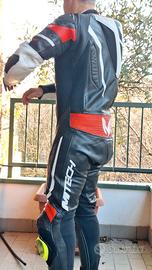 Tuta in pelle integrale MTECH del 2021 modello "Halo". Classe di protezione AAA. Ottima per pista e strada. Taglia 50. Sempre pulita ed ingrassata a fine stagione. Sopra le ginocchia rinforzo delle cuciture per correggere un'abrasione provocata dalle saponette troppo basse. La tuta non ha altri difetti (come da foto).