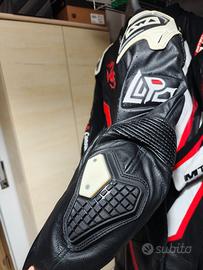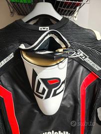 Stupenda tuta pelle racing CON AIRBAG in pelle di canguro traforata realizzata su disegno unico da AWA RACING. PARASCHIENA INTEGRATO. DUE BOMBOLE GAS PER AIRBAG IN DOTAZIONE e 3 paia di saponette ulteriori in diversi colori.