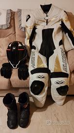 Vendo tuta in pelle intera suomy taglia 50 in ottime condizioni, con saponette nuove immacolate, protezioni anche, avambracci, spalle e schiena, vendo per errata misura o scambio con tuta intera di misura più grande nelle medesime condizioni!