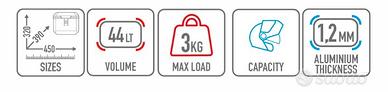 Codice ricambio: ALP44A2 possibilità di spedizione o ritiro in negozio Baule / bauletto posteriore top case GIVI ALP44 A2 - ALP 44 A2 ALPINA MONOLOCK 44 lt. in alluminio naturale, con sistema di sgancio dall'interno CRABLOCK. Comprensivo di piastra e kit universale Alpina è il nuovo bauletto della gamma Monolock realizzato in alluminio, con uno spessore del materiale di 1,2 mm per garantire maggior leggerezza ad un prezzo più contenuto. Alpina è dotato del nuovo sistema Crablock, il quale permette di sganciare il bauletto dalla piastra ruotando una leva posizionata internamente. Questo sistema rende più sicura la rimozione del bauletto, che può dunque essere sganciato solamente quando è aperto. L’utilizzo di una guarnizione sul fondo garantisce un grado di tenuta all’acqua corrispondente ad una normale pioggia, e gli interni rivestiti in feltro permettono di mantenere al sicuro gli oggetti trasportati.