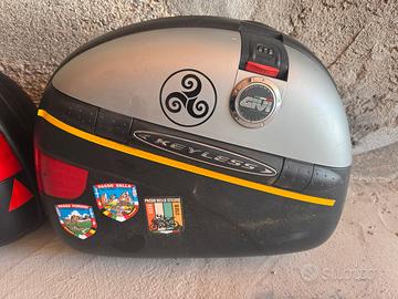 Valigie laterali givi keyless tenute in ottimo stato, doppie chiavi, entrambi i bauli si aprono sia dalla parte superiore sia nel modo classico lateralmente