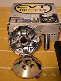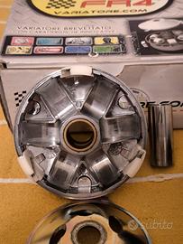 Vendo variatore Piaggio CVT FR4 Cod.VP070CD0390 in ottime condizioni pari al nuovo come in foto. Usato per 10 minuti poi nuovamente chiuso in scarola. No perditempo No affaristi Prezzo leggermente trattabile. Il kit è formato da: Puleggia mobile pressofusa con bronzina sdoppiata Calotta guidarulli CNC in acciaio lucidato e nitrurato, ricavata dal pieni Guide-cursori CNC ricavati dal pieno Anello di rinforzo in acciaio CNC Boccola in acciaio cromato due serie da 6 rulli di peso 3,8 grammi e 4,2 grammi. Il top del top.