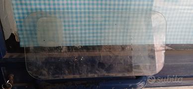 Vetro posteriore per Piaggio Ape 50. - Ricambio originale. - Materiale: vetro. - Forma: rettangolare con angoli arrotondati.