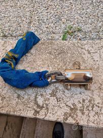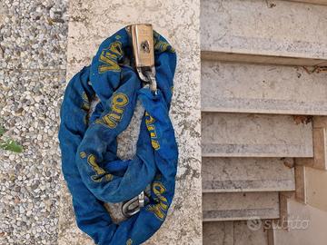 Viro 4251.1 Blocca catena da 2 m 10 mm con rivestimento anti graffio. Blocca catena molto sicuro e resistente, particolarmente adatto alla chiusura di scooter e moto. Lunghezza catena: 200 cm. Peso del prodotto: 4.810 kilogrammi. Sezione catena semiquadra: 10 mm. Buone condizioni generali e fornito di n.1 chiave.