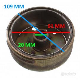 (R.13278) Vendo rotore generatore con rotazione a destra completo di statore usato per scooter vari con impianto elettrico tipo giapponese probabilmente Honda - Suzuki - Yamaha - MBK marchiato F4CW 72V con diametro interno volano 91 mm e diametro esterno 109 mm , per misure vedere foto