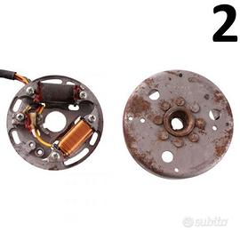 Codice ricambio: 10955 (R.10955) Vendo rotore generatore Ducati Energia usato per Malaguti Grizzly RCW4 50 cc dal 1990 con motore Franco Morini T4 con rotazione sinistra , con codice Malaguti 62008700 , per misure con applicazioni ed esploso vedere foto , il prezzo si intende per il singolo pezzo , più modelli disponibili : - Numero 1 :contutte le masse crepate come da foto ma che non si muovono , con codice 310989 L , con conicità da 12 mm a 15 mm e con diametro interno 81 mm , euro 70 - Numero 2 : volano con statore elettronico , con codice 310989 R , euro 150 - Numero 3 : solo volano con codice 310989 , euro90