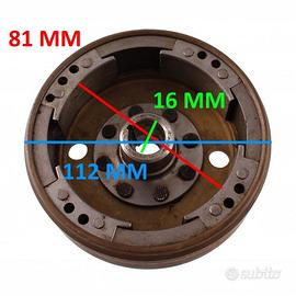(R.18735) Vendo rotore generatore a 4 poli usato con rotazione a destra in senso orario per ciclomotori vari epoca marchiato DansiADP213RA con diametro interno 81 mm ed esterno 112 mm con diametro foro cono 16 mm , per misure vedere foto