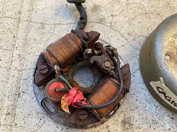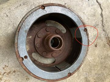 Il volano presenta una piccola crepa in una delle piastre che trattiene il magnete (vedi foto dettaglio cerchiato in rosso), mentre lo statore e' sicuramente da ripulire e rivedere. La moto e' rimasta ferma sotto un portico per oltre 20 anni senza il carter del volano, quindi e' entrata umidità e polvere. Si era rotta la chiavetta sull'albero che fa incastrare il volano e quindi era stata poi messa a riposo.