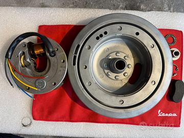 Vendo come da titolo volano originale dell'epoca, usato, ma in eccellenti condizioni senza crepe o parti mancanti, completo di statore, gommino finestrella puntine, dado, rondella dentata ed anello elastico, sede chiavetta integra.