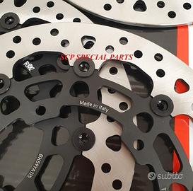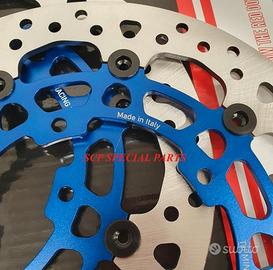 Dischi freno RM2 racing per upgrade MAGGIORAZIONE a 320mm di moltissimi modelli Yamaha: - la maggiorazione del diametro disco freno offre un'importante miglioramento della frenata - i dischi sono full flottanti quindi garantiscono un perfetto accoppiamento con la pastiglia freno per una frenata immediata senza ritardi ed efficace - spessore 5,5mm che previene il fastidioso fenomeno di fading, ovvero quanto all'aumentare delle temperature dei dischi e il conseguente aumento della temperatura di tutto l impianto frenante la pompa freno diventa spugnosa e si "allunga" la corsa della stessa - diametro 320mm, upgrade di maggiorazione da 10 a 20 mm in piu a seconda dei modelli di moto. - 300 grammi CIRCA la coppia piu leggeri dei dischi brembo, a tutto beneficio della maneggevolezza dell'avantreno della moto - mozzo in lega alleggerita anodizzata blu ufficiale Yamaha - pista frenante racing con speciale lavorazione a cuspide per un perfetto utilizzo della pastiglia freno il kit dischi costituisce upgrade a 320mm per tutti i modelli indicati di seguito. Nel kit vengono forniti anche i perni e distanziali per le pinze specifici per l'upgrade a 320 mm ricavati dal pieno e possono essere anodizzati di qualsiasi colore su richiesta. DISCHI RM2 UPGRADE A 320mm per: · YZF-R1 07-08 · YZF-R1 09-11 · YZF-R1 12-14 · YZF-R6 05 · YZF-R6 06-07 · YZF-R6 08-09 · YZF-R6 10-16 · MT-09 14-16 · MT-09 14-16 ABS · MT-09 17-20 · MT-09 21- · MT-09 SP 18-20 · MT-09 SP 21- · TMAX 530 15-16 · TMAX 530 17-19 · TMAX 560 20-21 · TMAX 560 Tech Max 560 20-21 · Tracer 9 · Tracer 9 GT · Tracer 900 15-17 · Tracer 900 18-20