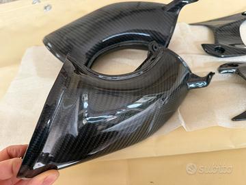 -Convogliatori aria carbonio e cover carbonio totale con codice identificativo €250 -tubi treccia goodridge 50€ -regolatore tensione originale +statore+magneti tutto funzionante 200€ -coperchio statore originale 150€ -gomme pirelli rosso corsa 3 tenute ferme in garage,quindi battistrada totalmente utilizzabile nonostante dot. 100€ coppia