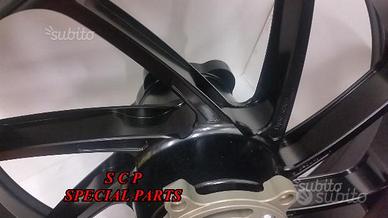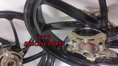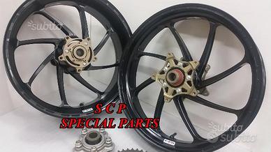 Cerchi PVM a 8 razze, realizzati in alluminio forgiato sportversion lightweight. Questo nuovo modello consente di avere la resistenza e robustezza dell'alluminio abbinato ad un peso comparabile al magnesio. Infatti i cerchi sono leggerissimi: l'anteriore pesa 3.4 kg completo delle flange dischi e il posteriore 4.2 kg completo di flange per un totale di soli 7,6 kg la coppia! Un peso eccezionale, come i migliori cerchi in magnesio ma con la resistenza dell'alluminio forgiato e una durata nel tempo nettamente superiore. La notevole centralizzazione delle masse ottenuta nella realizzazione di questa tipologia di cerchi, abbinata all'estrema leggerezza, fa si che vi sia una diminuzione drammatica dell'effetto giroscopico. Ciò si traduce in cambi di direzione fulminei abbinati alla possibilità di ritardare molto di più la staccata e alla capacità nettamente superiore della moto di tenere la corda e poter disegnare traiettorie molto più strette a netto vantaggio dell'uscita di curva. I cerchi sono anodizzati e sono disponibili varie colorazioni. Mozzo portacorona e Corona speciale sono in omaggio. Si montano plug and play sulla moto senza nessuna modifica. Come optional si possono avere il kit dischi freno racing supersport o t drive realizzati da brembo e le pinze freno racing brembo.