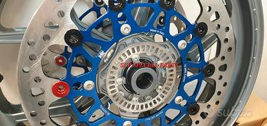 SET CERCHI RUOTE PVM UFFICIALI WORLD SUPERBIKE 2024 2025 GLI STESSI UTILIZZATI DAL TEAM BMW UFFICALE SBK CAMPIONE DEL MONDO 2024 CON TROPRAK RAZGATLIOGLU. Specifici per: YAMAHA R6 2017 2024 e 2006 2016 con kit boccole dedicate Alluminio forgiato. PLUG AND PLAY SI MONTANO SENZA MODIFICHE COMPLETI DI LAVORAZIONE ANTISLIP SUL CANALE. QUESTO TRATTAMENTO IMPEDISCE ALLA GOMMA DI "GIRARE SUL CERCHIO" EVITANDO COSI' PERICOLOSI ONDEGGIAMENTI E MIGLIORANDO IL FEELING NELLE FASI DI ACCELERAZIONE E FRENATA. I cerchi sono anodizzati nel fantastico TITANIO UFFICIALE PVM e questo offre una durata nel tempo e una resistenza impossibile con la normale verniciatura. Set costituito da: -Coppia cerchi pvm forgiati modello 5Y -Dischi racing RM2 full flottanti 320 x 5,5mm made in italy, blu oppure neri. (in foto) -Dischi superbike RM2 full flottanti 320 x 6mm modello acrux, OPZIONALI. -ruote foniche -mozzo porta corona -corona alleggerita in ergal passo 520 -valvole a 90° IL SET CERCHI GARANTISCE L'OTTENIMENTO DI UNA MANEGGEVOLEZZA ELEVATISSIMA A TUTTO VANTAGGIO DI CAMBI DIREZIONE RAPIDISSIMI CON LA POSSIBILITA' DI RITARDARE AL MASSIMO LA STACCATA CON INGRESSI IN CURVA FULMINEI. La coppia di dischi prodotta da RM2 è full flottante, campana in ergal alleggerita e anodizzata e pista frenante da 320mm x 5,5mm di spessore, oppure su richiesta anche da 6,00 mm versione acrux. I dischi sono full flottanti quindi garantiscono un perfetto accoppiamento con la pastiglia freno per una frenata immediata senza ritardi ed efficace. I dischi annullano il fastidioso fenomeno fading, ovvero quando all'aumentare delle temperature di esercizio la pompa freno diventa spugnosa e si "allunga" la corsa . La pista frenante racing con speciale lavorazione del profilo a cuspide offre una perfetta resa della pastiglia freno. I DISCHI GARANTISCONO UNA POTENZA FRENANTE NOTEVOLMENTE AUMENTATA A PARITA' DI PRESSIONE SULLA LEVA.