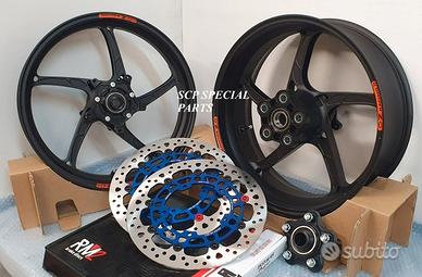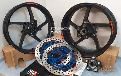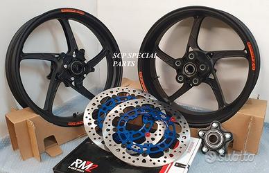 KIT MADE IN ITALY RUOTE CERCHI FORGIATI OZ PIEGA R E DISCHI FULL FLOTTANTI RM2, specifici per: YAMAHA R6 2006 - 2016 YAMAHA R6 2017 - 2023 LA COPPIA DI CERCHI OZ PIEGA R PESA SOLAMENTE 8,3 KG COMPRESO IL MOZZO PORTA CORONA, MOLTI KG IN MENO RISPETTO AGLI ORIGINALI! L'ultima evoluzione di ruote forgiate Racing in alluminio a 5 razze. Ogni particolare è stato curato per avere prestazioni esaltanti di massimo livello. Affidabili e robuste sono la scelta di importanti case motociclistiche che già le utilizzano per i loro team ufficiali. DISPONIBILI NEI COLORI ANODIZZATI Nero opaco Nero lucido Oro La coppia di dischi RM2 è full flottante con campana in ergal alleggerito , massima performance, con pista frenante da ben 5,5 mm di spessore e diametro 320 mm (si possono mantenere le pinze freno di serie). DISPONIBILI ANCHE IN VERSIONE CON SPESSORE 6 MM PER IMPIEGO RACING/GARA I dischi full flottanti garantiscono un perfetto accoppiamento con la pastiglia freno per una frenata immediata senza ritardi ed efficace. Lo spessore da 5,5 mm annulla il fastidioso fenomeno di fading, ovvero quando all'aumentare delle temperature di esercizio dei dischi e il conseguente aumento della temperatura di tutto l impianto frenante la pompa freno diventa spugnosa e si "allunga" la corsa della stessa. La pista frenante racing da 320mm con speciale lavorazione del profilo a cuspide offre una perfetta resa della pastiglia freno e un notevole aumento della potenza frenante. QUESTO SET SPECIALE GARANTISCE L'OTTENIMENTO DI UNA MANEGGEVOLEZZA ELEVATISSIMA A TUTTO VANTAGGIO DI CAMBI DIREZIONE RAPIDISSIMI CON LA POSSIBILITA' DI RITARDARE AL MASSIMO LA STACCATA CON INGRESSI IN CURVA FULMINEI. I DISCHI GARANTISCONO UNA POTENZA FRENANTE NOTEVOLMENTE AUMENTATA A PARITA' DI PRESSIONE SULLA LEVA