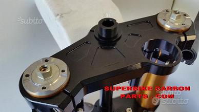 YAMAHA R6: PIASTRE DI STERZO SPECIALI RICAVATE DAL PIENO CON MACCHINARI A CONTROLLO NEMERICO, PROTOTIPATE PER FORCELLE STANDARD O OHLINS OPPURE MARZOCCHI O DI QUALSIASI ALTRA MARCA. Il kit piastre è costituito da piastra di sterzo inferiore con asse canotto e piastra di sterzo superiore. Semimanubri racing ricavati dal pieno su richiesta. Per il montaggio si utilizzano boccole e cuscinetti originali. Possiamo realizzare Cave di alleggerimento passanti sulla piastra inferiore e superiore. Un prodotto rivoluzionario per efficacia, risorse tecniche e costo contenuto. Possibilità di scegliere qualsiasi colore per l'anodizzazione. Le piastre di sterzo sono progettate appositamente per migliorare il feeling con l'avantreno eliminando il chattering rendendo la moto piu' stabile in inserimento curva e percorrenza. La lega speciale utilizzata (testata in pista nei principali campionati internazionali e non come fanno quasi tutti gli altri produttori senza know how sui campi gara!!) E' studiata appositamente per assorbire le sollecitazioni e permettere alle sospensioni di lavorare molto meglio. Off set standard oppure speciale regolabile a richiesta. Replichiamo attacchi quadro strumenti e blocca sterzo se presenti e su richiesta. Il cliente può scegliere qualsiasi tipologia e forma per il progetto delle piastre di sterzo entro i limiti imposti dalla quote della moto stessa, prendendo spunto dai nostri lavori precedentemente effettuati.