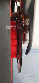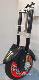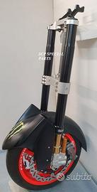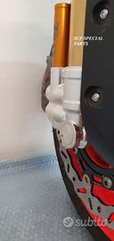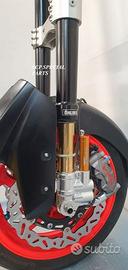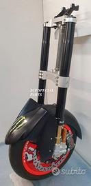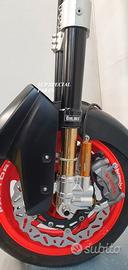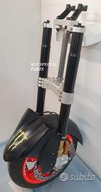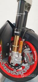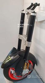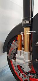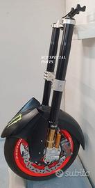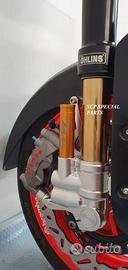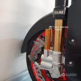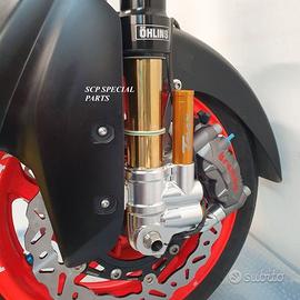 Progettiamo e Realizziamo avantreni speciali con forcelle ohlins e freni brembo, su misura per: maxi scooter, cafe racer, scrambler, brat, custom, streetfighter, superbike, prototipi, show bike, maxi enduro, off road. ESCLUSIVITA', PERFORMANCE, SICUREZZA, ESTETICA AL TOP! PRESENTIAMO AVANTRENO PER YAMAHA TMAX 560 TMAX 530 TMAX 500, disponibile per: Yamaha T max 560 Yamaha T max 530 dal 2015 al 2019 Yamaha T max 530 dal 2012 al 2014 Yamaha T max 500 dal 2008 al 2011 Yamaha T max 500 fino al 2007 (in foto) Avantreno costituito da: - FORCELLE OHLINS REGOLABILI allestite su misura in base al modello T MAX, forcelle R&T con stelo 43mm e fodero da 54mm a 56mm (disponibili su richiesta anche forcelle OHLINS NIX SUPERBIKE) - PIEDINI FORCELLE RADIALI RICAVATI DAL PIENO, con forma tipo OHLINS PRESSURIZZATE e serigrafia logo TMAX se richiesto. - PIASTRE DI STERZO RICAVATE DAL PIENO SU MISURA con attacchi originali - STAFFA SUPPORTO BLOCCHETTO ACCENSIONE RICAVATA DAL PIENO - STAFFE PARAFANGO RICAVATE DAL PIENO - STAFFA SUPPORTO SENSORE ABS RICAVATA DAL PIENO (se presente) OPTIONAL: - pinze BREMBO radiali, vari modelli disponibili - dischi BREMBO da 300mm 310mm e 320mm - dischi RM2 da 320mm - monoammortizzatore posteriore OHLINS PRESSURIZZATO IL KIT E' SU MISURA IN BASE AL MODELLO DI TMAX. SI INSTALLA SENZA NESSUNA MODIFICA MANTENENDO TUTTE LE PARTI ORIGINALI. PER I MODELLI DAL 2015 IN AVANTI SI MANTENGONO PARAFANGO, CERCHIO, DISCHI E PINZE RADIALI ORIGINALI . PER I MODELLI T MAX FINO AL 2014 E' NECESSARIO SOLO MONTARE PINZE RADIALI . Le forcelle ohlins possono essere fornite con fodero anodizzato oro oppure anodizzato in altri colori come optional. Possiamo progettare e realizzare qualsiasi modifica su richiesta.