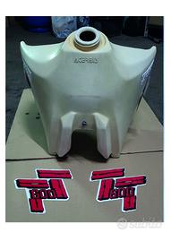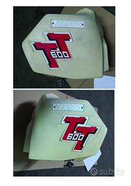 Soffietti forcella non originali 15 euro staffe per pedane passeggero originali 50 euro Staffa conta Km 10 euro paramotore 15 euro pedane non originali 15 euro para disco originale 50 euro paramani acerbis 15 euro Manubrio Yamaha 30 euro Cerchio Posteriore 250 euro Sella da rifoderare 50 euro Serbatoio maggiorato acerbis per tt 600 59x lt 22 in buonissime condizioni, compreso di rubinetti benzina, no tappo, comprende doppia possibilità di grafiche 250 euro