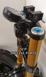 Kit costituito da: Forcelle OHLINS allestite SPECIFICATAMENTE. Le forcelle sono corredate da piedini radiali e il kit è completo di impianto frenante radiale BREMBO, piastre di sterzo speciali ricavate dal pieno. Riser ricavati dal pieno con altezza standard regolabili nel diametro e nella altezza. Staffe parafango ricavate dal pieno con parafango in carbonio e coppia cerchi oz.