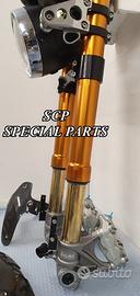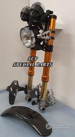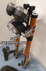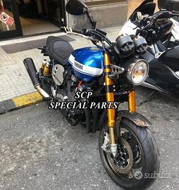 PROTOTIPIAMO E REALIZZIAMO AVANTRENI SPECIALI SU MISURA PER QUALSIASI MOTO. RIPETIAMO: OGNI AVANTRENO E' REALIZZATO SPECIFICO SU MISURA E IN BASE AI PROPRI DESIDERI E NECESSITA' SICUREZZA, PERFORMANCE, ESCLUSIVITA' AL TOP!!! LA FINALITA' DI TALI PROGETTI E' RENDERE UNICA LA VOSTRA MOTO QUALUNQUE ESSA SIA. PRESENTIAMO AVANTRENO COMPLETO PER YAMAHA XJR 1300 E 1200. AVANTRENO CON FORCELLE OHLINS NIX 30 CON STELO DA 48mm E FODERO DA 58mm, PIASTRE DI STERZO SU MISURA RICAVATE DAL PIENO CON RISER, PIEDINI FORCELLE RADIALI , PINZE BREMBO RADIALI, PARAFANGO CARBONIO E KIT DI MONTAGGIO. IL KIT E' PLUG AND PLAY! SPECIFICO! SI MONTA SENZA NESSUNA MODIFICA! REALIZZATO SPECIFICATAMENTE PER MANTENERE CERCHIO ORIGINALE, FARO E QUADRO STRUMENTI XJR STANDARD. Kit costituito da: Forcelle OHLINS allestite SPECIFICATAMENTE. Le forcelle sono corredate da piedini radiali e il kit è completo di impianto frenante radiale BREMBO, piastre di sterzo speciali ricavate dal pieno. Riser ricavati dal pieno con altezza standard regolabili nel diametro e nella altezza. Staffe parafango ricavate dal pieno con parafango in carbonio. Per il montaggio si utilizzano boccole e cuscinetti originali. Possiamo progettare e realizzare qualsiasi specifica atta a rendere unica tale tipologia di prodotto. Tutte le parti ricavate dal pieno possono essere progettate direttamente su specifiche tecniche ed estetiche del cliente e anodizzate di qualsiasi colore. Sulle piastre possiamo replicare attacchi e supporti originali per telaietto, quadro strumenti, blocco accensione, blocca sterzo, ammortizzatore di sterzo etc oppure possiamo farne su misura . Optional disponibili: cerchi a raggi su misura cerchi forgiati a razze Oz, Dymag, Pvm, dischi e pinze brembo attacchi e modifiche alle piastre e non solo su misura.