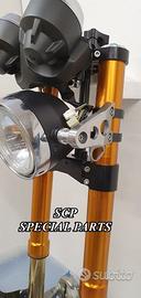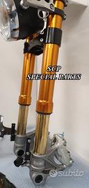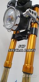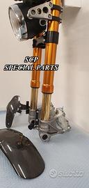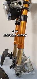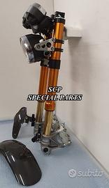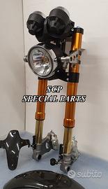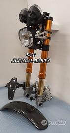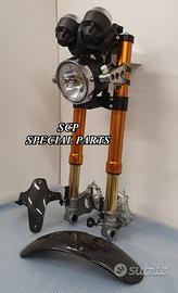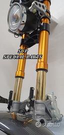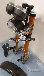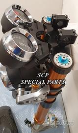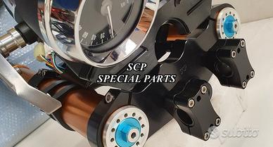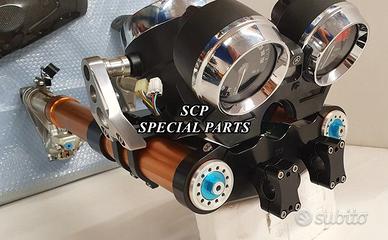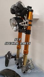 PROTOTIPIAMO E REALIZZIAMO AVANTRENI SPECIALI PER QUALSIASI MOTO. OGNI AVANTRENO E' REALIZZATO SPECIFICO SU MISURA. SICUREZZA, PERFORMANCE, ESCLUSIVITA' AL TOP!!! LA FINALITA' DI TALI PROGETTI E' RENDERE UNICA LA VOSTRA MOTO QUALUNQUE ESSA SIA. PRESENTIAMO AVANTRENO COMPLETO PER YAMAHA XJR 1300 E 1200. AVANTRENO CON FORCELLE OHLINS NIX 30 CON STELO DA 48mm E FODERO DA 58mm, PIASTRE DI STERZO SU MISURA RICAVATE DAL PIENO CON RISER, PIEDINI FORCELLE RADIALI , PINZE BREMBO RADIALI, PARAFANGO CARBONIO E KIT DI MONTAGGIO. IL KIT E' PLUG AND PLAY! SPECIFICO! SI MONTA SENZA NESSUNA MODIFICA! REALIZZATO SPECIFICATAMENTE PER MANTENERE CERCHIO ORIGINALE, FARO E QUADRO STRUMENTI XJR STANDARD. Kit costituito da: Forcelle OHLINS allestite SPECIFICATAMENTE. Le forcelle sono corredate da piedini radiali e il kit è completo di impianto frenante radiale BREMBO, piastre di sterzo speciali ricavate dal pieno. Riser ricavati dal pieno con altezza standard regolabili nel diametro e nella altezza. Staffe parafango ricavate dal pieno con parafango in carbonio. Per il montaggio si utilizzano boccole e cuscinetti originali. Possiamo progettare e realizzare qualsiasi specifica atta a rendere unica tale tipologia di prodotto. Tutte le parti ricavate dal pieno possono essere progettate direttamente su specifiche tecniche ed estetiche del cliente e anodizzate di qualsiasi colore. Sulle piastre possiamo replicare attacchi e supporti originali per telaietto, quadro strumenti, blocco accensione, blocca sterzo, ammortizzatore di sterzo etc oppure possiamo farne su misura . Optional disponibili: cerchi a raggi su misura cerchi forgiati a razze Oz, Dymag, Pvm, dischi e pinze brembo attacchi e modifiche alle piastre e non solo su misura.